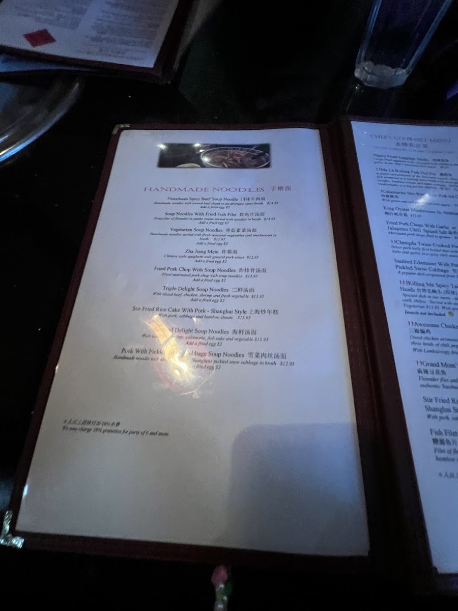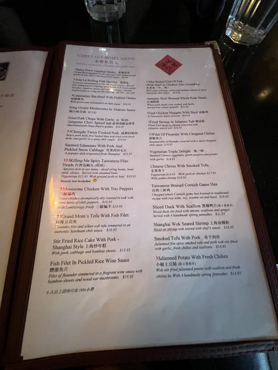 Spicy. A classic presentation of the szechuan region- filet of flounder simmered in a boiling spicy broth with sweet potato noodles, bamboo shoots, and napa cabbages seasoned with szechuan pepper corns, chilies and herbs. Served traditionally in a big pot for sharing.