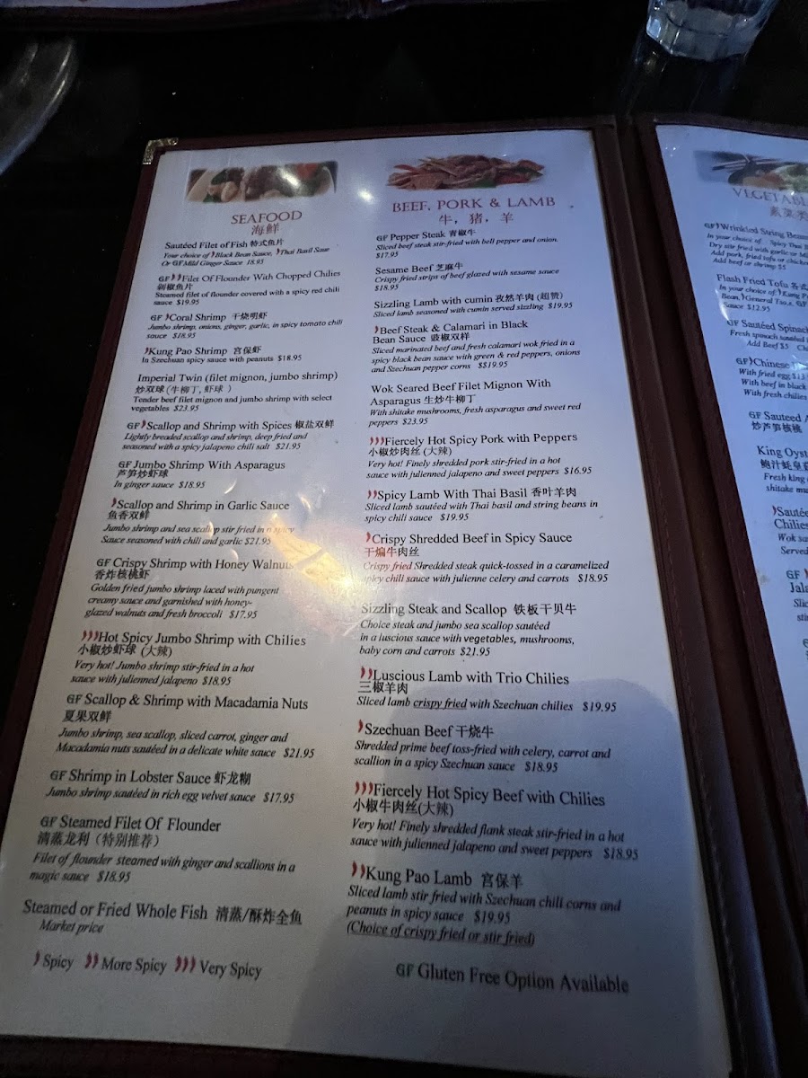 Sliced marinated beef and fresh calamari wok fried in a spicy black bean sauce with green, red peppers, onions, and szechuan peppercorns. Mild.